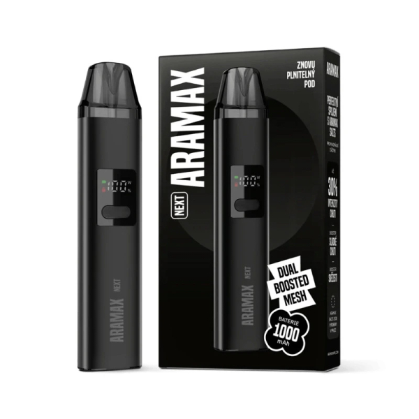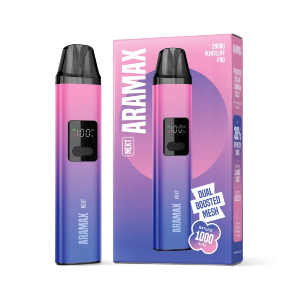 Aramax Next je kompaktní POD systém s baterií 1000 mAh, maximálním výkonem 20 W a rychlým nabíjením přes USB-C. Nabízí regulaci přívodu vzduchu, přehledný displej a kvalitní chuť díky technologií Dual Boost Mesh. Odpor 0,8 ohm je ideální pro mírnější RDL potah.